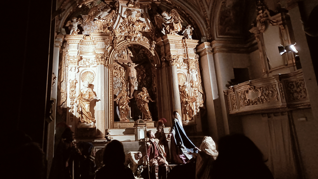 Uno spettacolo assolutamente imperdibile è Anghelos, allestito presso il meraviglioso Oratorio del Crocefisso, una natività vivente unica nel suo genere, dove i personaggi, vestiti nei sontuosi abiti barocchi della Giostra della Quintana, prendono vita, raffigurando episodi della natività. Un allestimento reso ancor più emozionante dall’accompagnamento di luci e musiche ideate e pensate per creare forti suggestioni sceniche, grazie anche all’atmosfera tardobaroccha fatta di stucchi dorati e decorazioni murali presenti all’interno dell’oratorio.